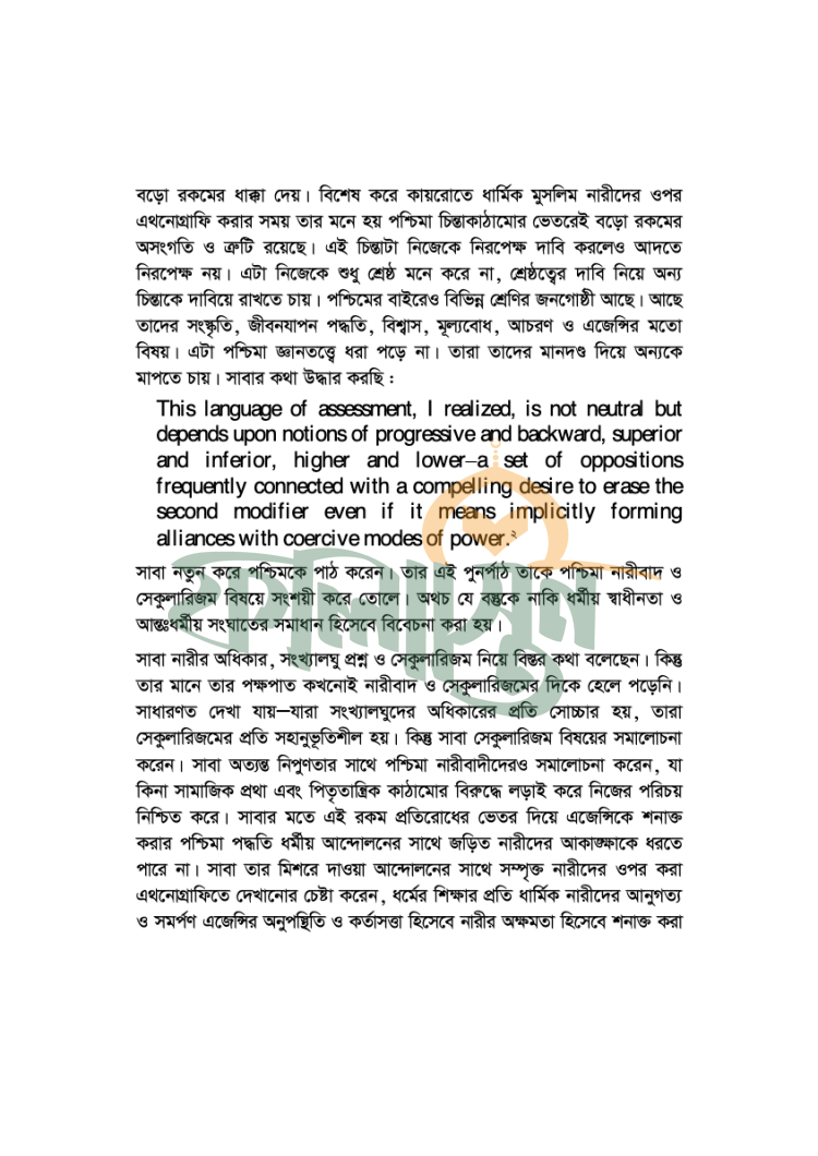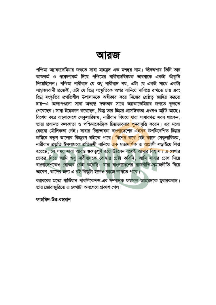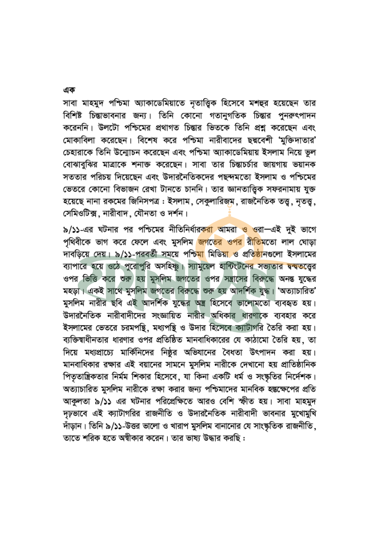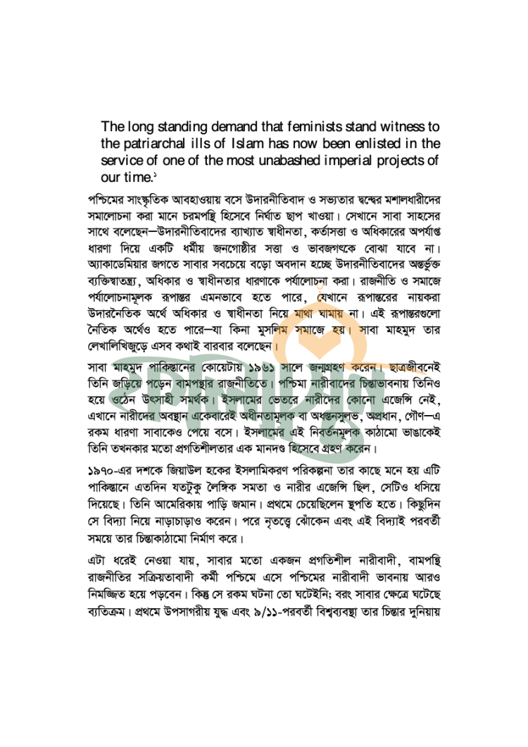 পশ্চিমা নারীবাদ নির্দোষ কিছু নয়। অন্তত সন্ত্রাসের বিরুদ্ধে অনন্ত যুদ্ধের কালে নারীবাদ কিভাবে সাম্রাজ্যবাদী প্রকল্পের অংশীদার হিসেবে কাজ করে। মুসলিম মেয়েরা নির্যাতিতও এই কথা বলে সাম্রাজ্যবাদ কিভাবে মুসলিম দেশগুলোকে শোষণ-শাসন করার পরিকল্পনা আঁটে এবং ইসলামের বিরুদ্ধে মুসলিম মেয়েদের ক্ষেপিয়ে তোলে তারই এক গভীর পর্যালোচনামূলক বয়ান হাজির করেছেন মশহুর নৃতত্ত্ববিদ সাবা মাহমুদ। সাম্রাজ্যবাদ ও নারীবাদকে যুগপৎভাবে বুঝার জন্য এ বই অপরিহার্য।